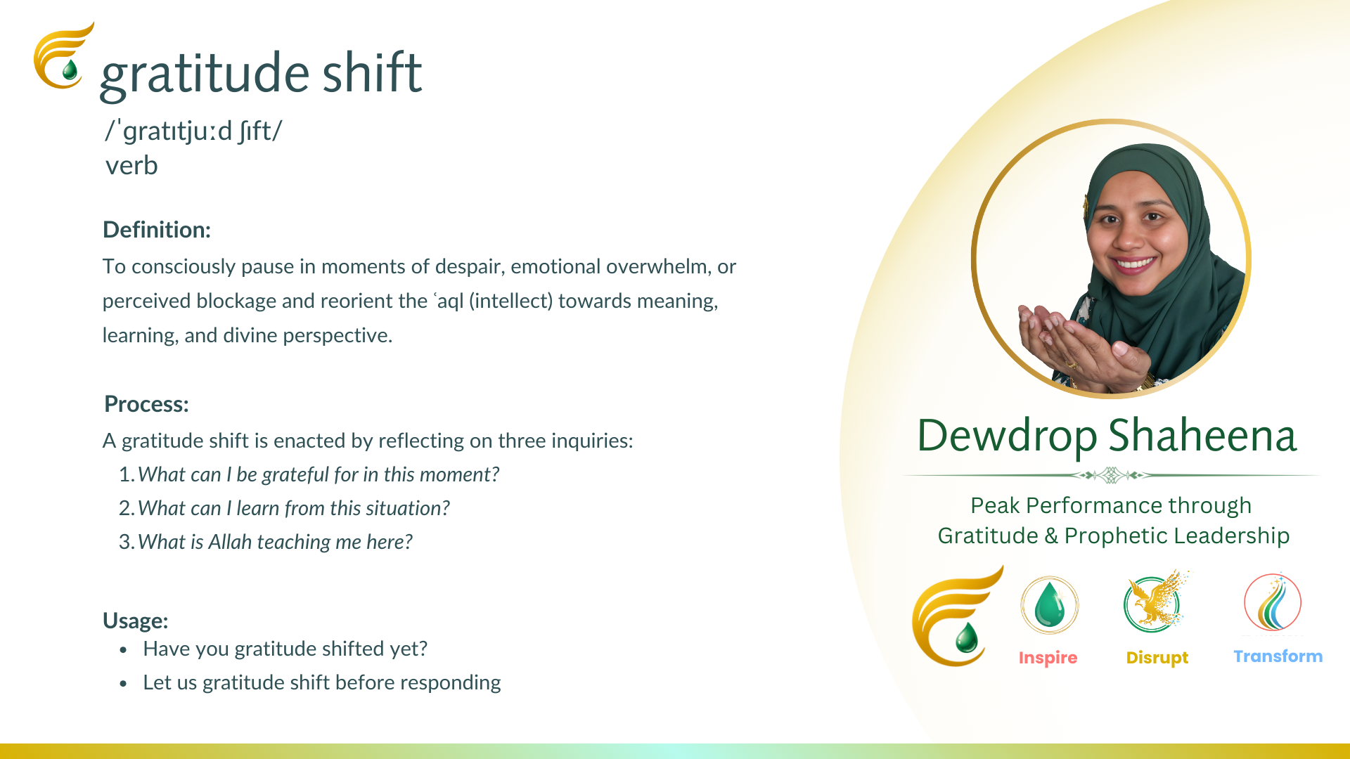 For faith-driven professionals seeking faith-aligned income, personal brands with barakah, coaching or speaking paths rooted in integrity, and peak performance without spiritual erosion, gratitude shifting becomes a daily leadership discipline. It trains leaders to interpret pressure through divine perspective rather than egoic urgency. Because how you interpret pressure determines how you lead under it, gratitude becomes the bridge between spiritual anchoring and sustainable performance.
